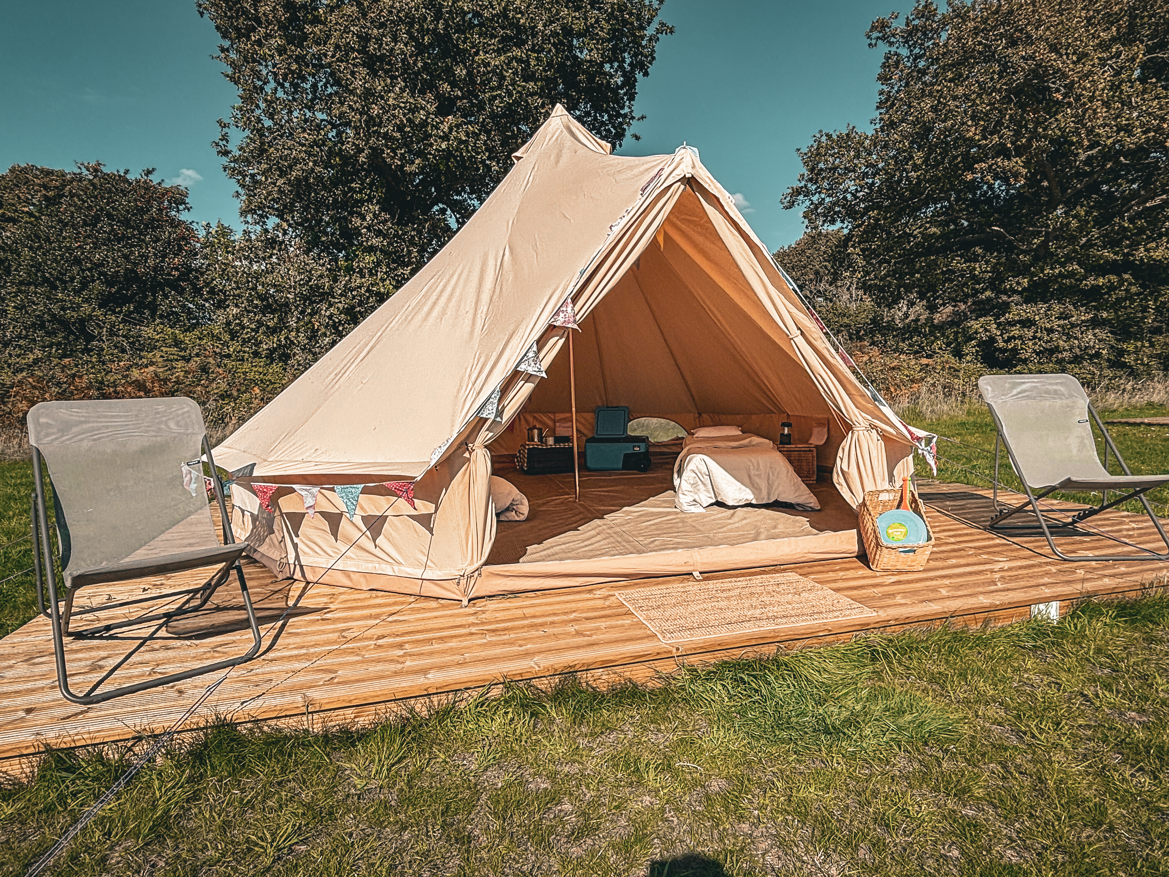 Our premium Bell tents sleep up to 5 in beds, and has a wooden base to keep in warmth.